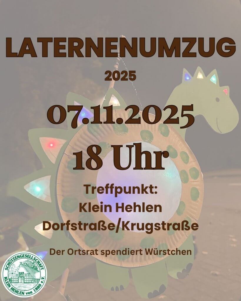 Es ist wieder soweit: Die dunkle Jahreszeit bringt uns die Gelegenheit, mit unseren Laternen Licht ins Dorf zu tragen! Am Freitag, den 1. November, lädt die Schützengesellschaft Klein Hehlen von 1880 e.V. alle Kinder, Eltern und Großeltern herzlich zum Laternenumzug ein: ein leuchtendes Highlight für Klein und Groß!